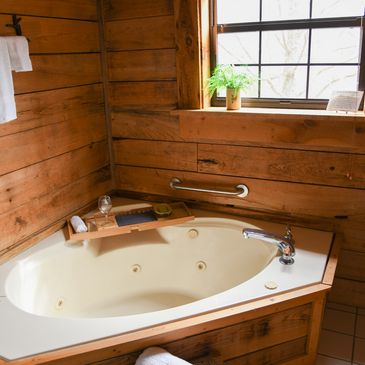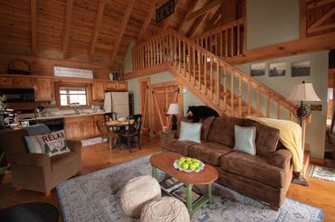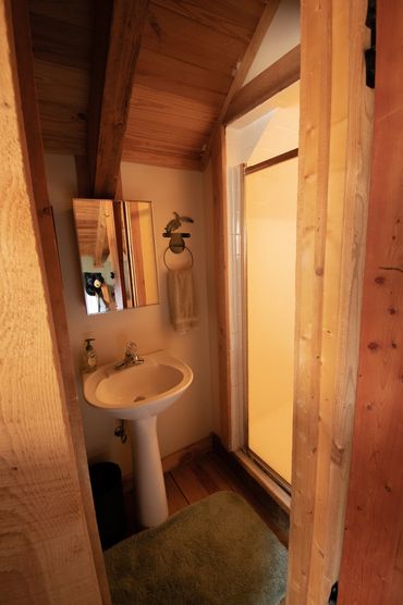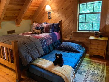 The cabin's loft features a queen-size bed, a twin-size trundle, and an attached bathroom with shower.