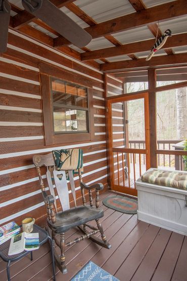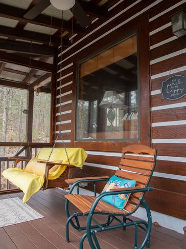 The Blue Door Cabin offers covered and uncovered porches on three sides of the cabin. Two of the porches can also be locked.